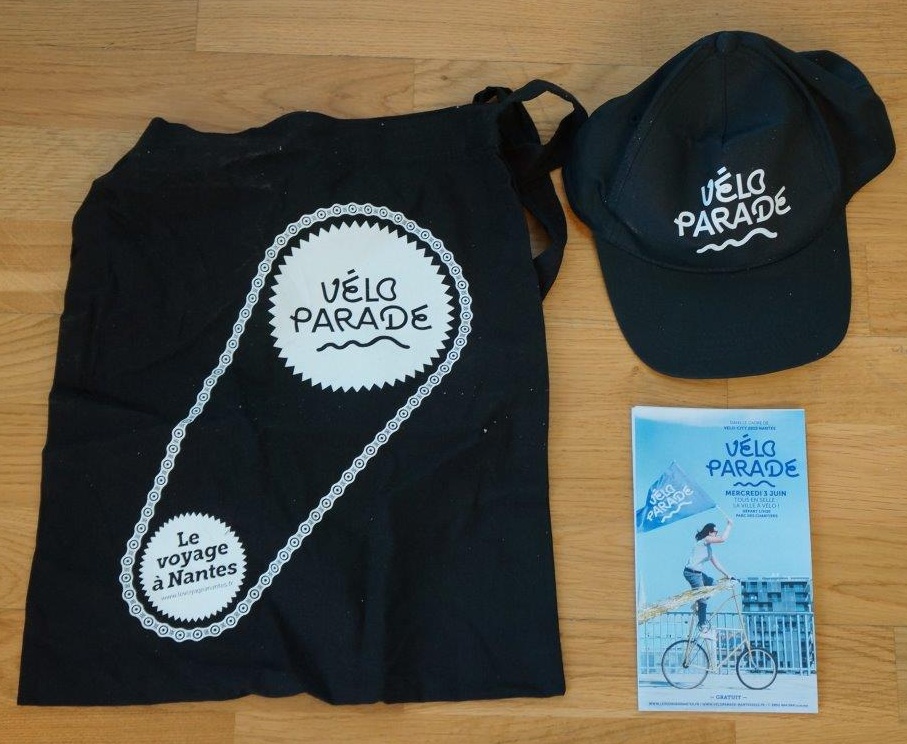 【写真右・皮製バッグと一緒に、ナイロン製のデイパックも支給。こちらは自転車グッズ。いずれにもナント都市共同体と大きく行政の名前が記載され、行政が予算を出していることをアッピールしている。】