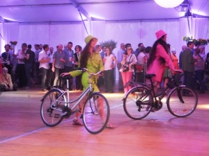【写真下・三国成子さん提供・会場内に貼られたテントの中では自転車用レインウエアのファッションショーも】